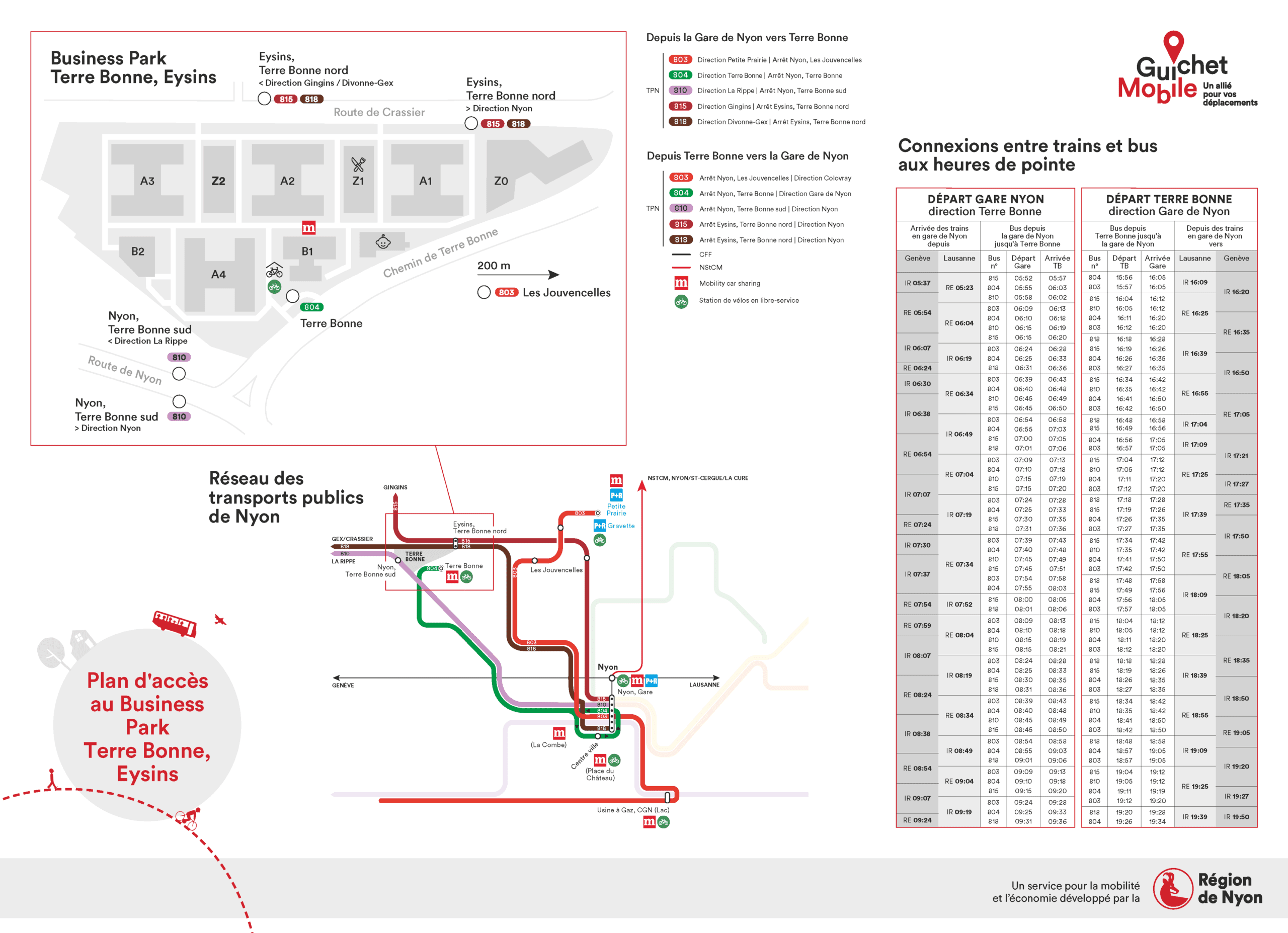 Le Business Park de Terre Bonne est situé en périphérie et accessible en transports publics depuis la gare de Nyon. Diverses lignes de bus desservent le site d’entreprises. La zone est aussi accessible en vélo depuis le centre en 10 min environ.